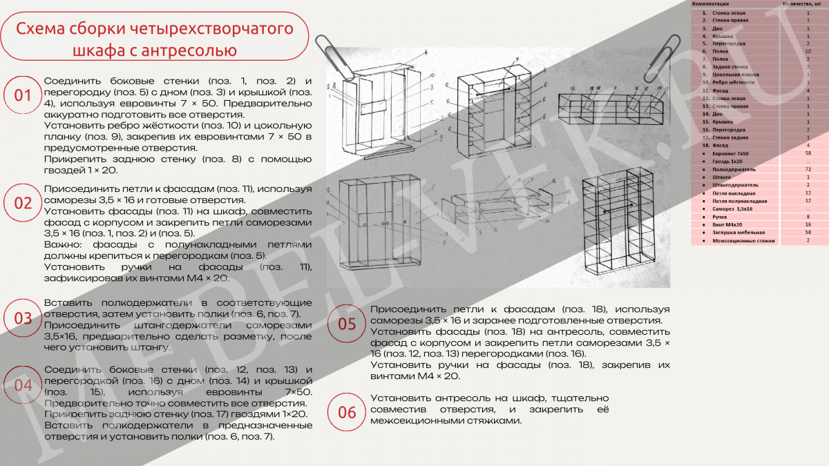 11. Схема сборки четырехстворчатого шкафа с антресолью - скачать.