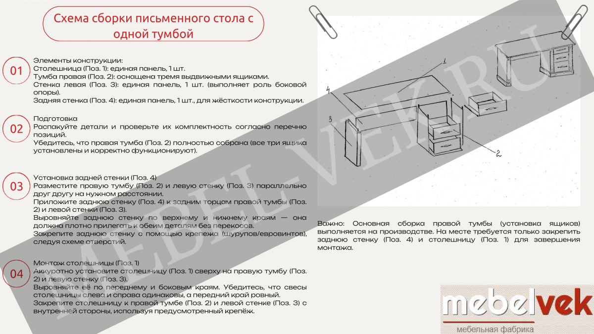 15. Схема сборки письменного стола с одной тумбой - скачать.